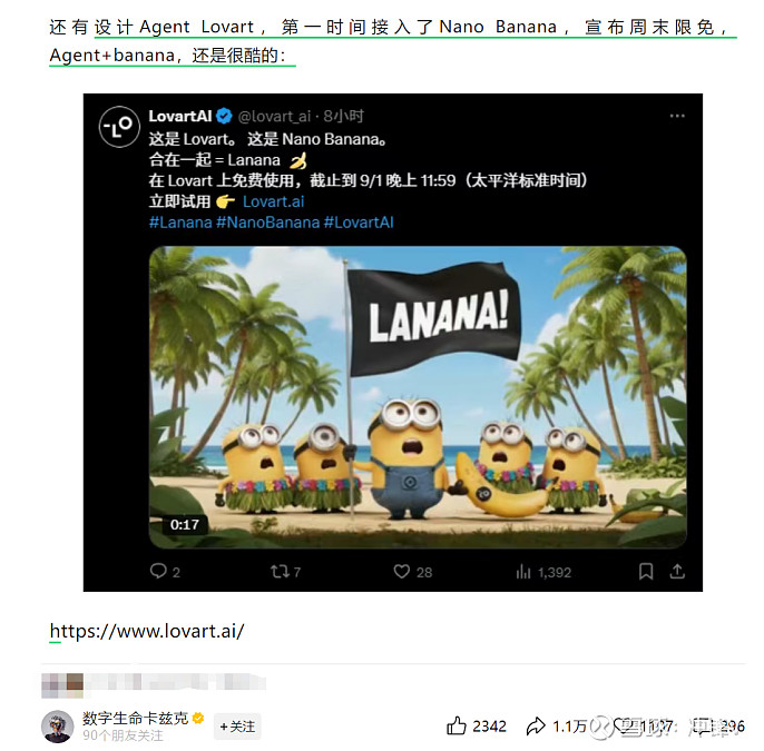 1\Nano Banana重构AI设计边界,郑中设计率先卡位“全流程智能创作”:8月30日发布的Nano Banana(从线条草图到完整效果图的全能改图工具),驱动设计革命。设计Agent Lovart,第一时间接入了Nano Banana,效果惊人,用户量暴增。