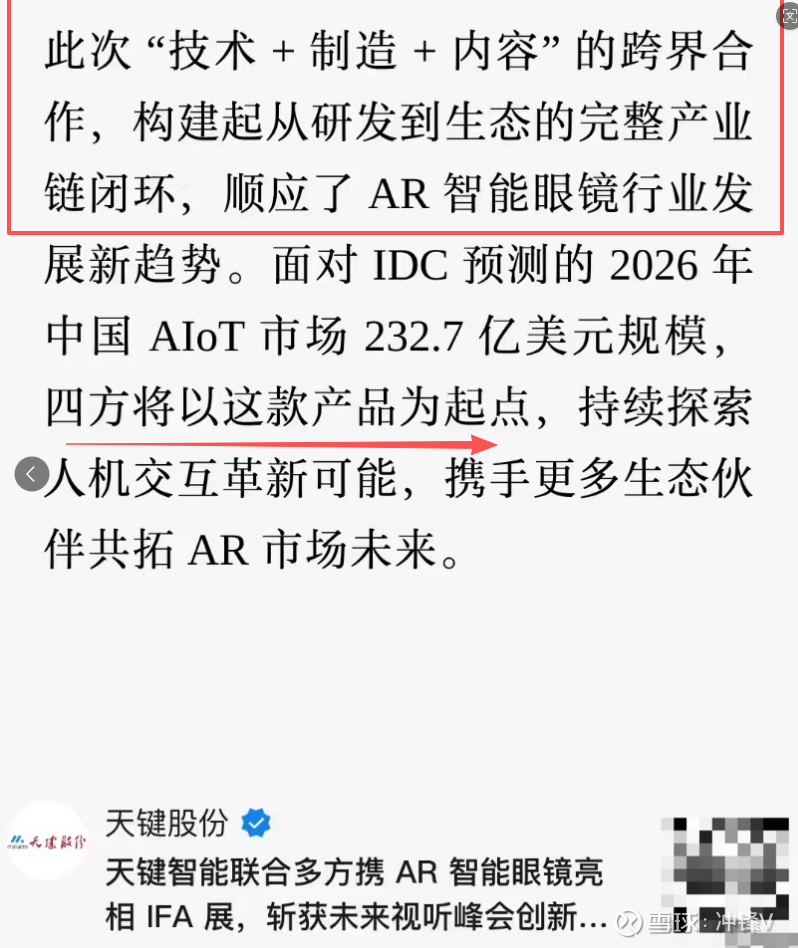 IDC预测,2026年中国AIoT市场规模将达232.7亿美元,AI眼镜作为“端侧核心终端”,需求年增速超50%。天键绑定字节这一头部生态,将优先享受行业增长红利——相比纯硬件厂商,天键的“生态绑定”带来更强客户粘性(字节不会轻易更换供应商)与更高议价能力。