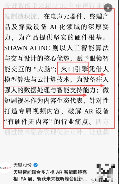 字节的选择很明确:用“火山引擎(大模型/云)+ SHAWN AI(交互)+ 微短剧(内容)+ 天键(硬件)”的四角闭环,破解“有算法无落地”的痛点。而天键作为字节AI眼镜唯一硬件供应商,精准承接了生态红利的“第一入口”——这是行业质变中最关键的卡位。