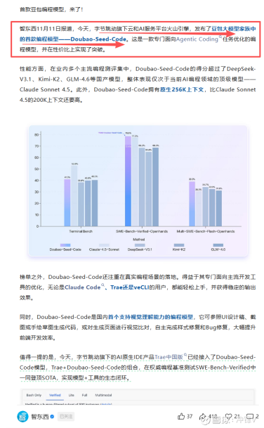 1、AI编程是全球唯一规模化落地的AI应用场景,字节跳动发布Doubao-Seed-Code模型(256k上下文、兼容多平台、成本降低62.7%),标志着AI编程从工具层向生态层跃迁,将加速企业数字化转型中的代码生成、系统运维和低代码开发需求。