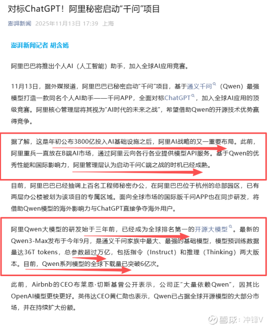 1、阿里秘密启动“千问APP”项目,基于Qwen最强模型打造对标ChatGPT的个人AI助手,标志着阿里AI战略从B端向C端重磅转身,将直接拉动底层算力基础设施需求指数级增长。
