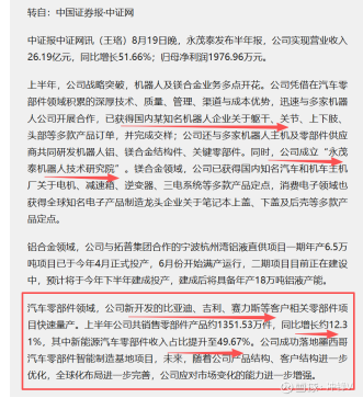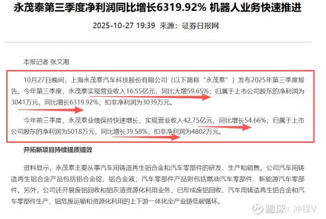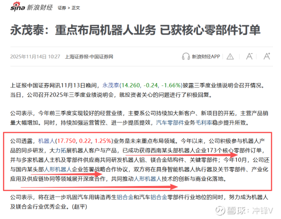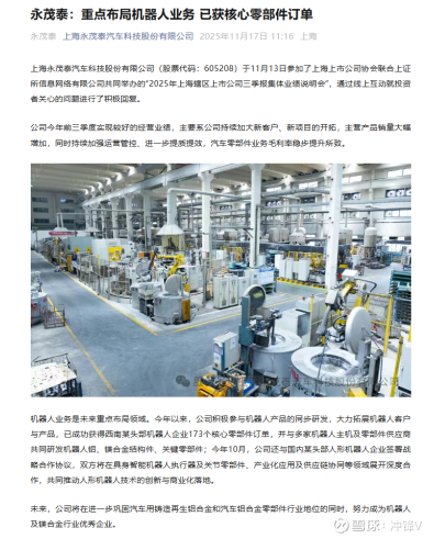 总结:永茂泰作为传统汽车零部件企业向机器人领域转型的稀缺标的,已展现出强大的技术迁移能力和客户拓展实力。随着人形机器人产业化加速,公司有望凭借先发优势,在智能制造浪潮中占据重要地位。$永茂泰(SH605208)$