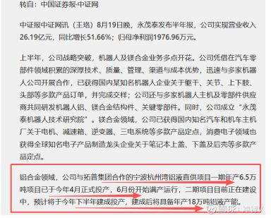 铝合金材料优势:公司在运行铝合金产能37.8万吨,与拓普集团合作的宁波杭州湾铝液直供项目一期已满产运行,二期预计下半年投产,形成成本优势。