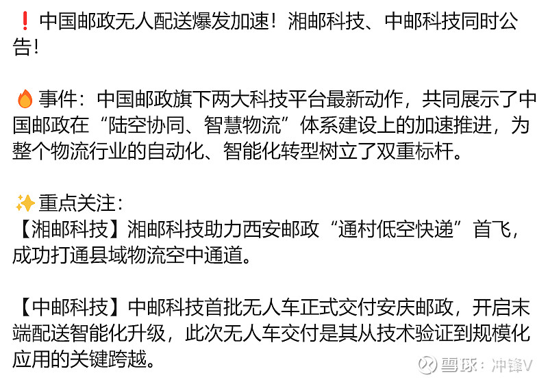 1、行业爆发点已至:中国邮政全面加速无人配送,旗下两大科技平台湘邮科技与中邮科技近期同步公告进展,标志着邮政无人配送体系从试点迈向规模化扩张的关键拐点。