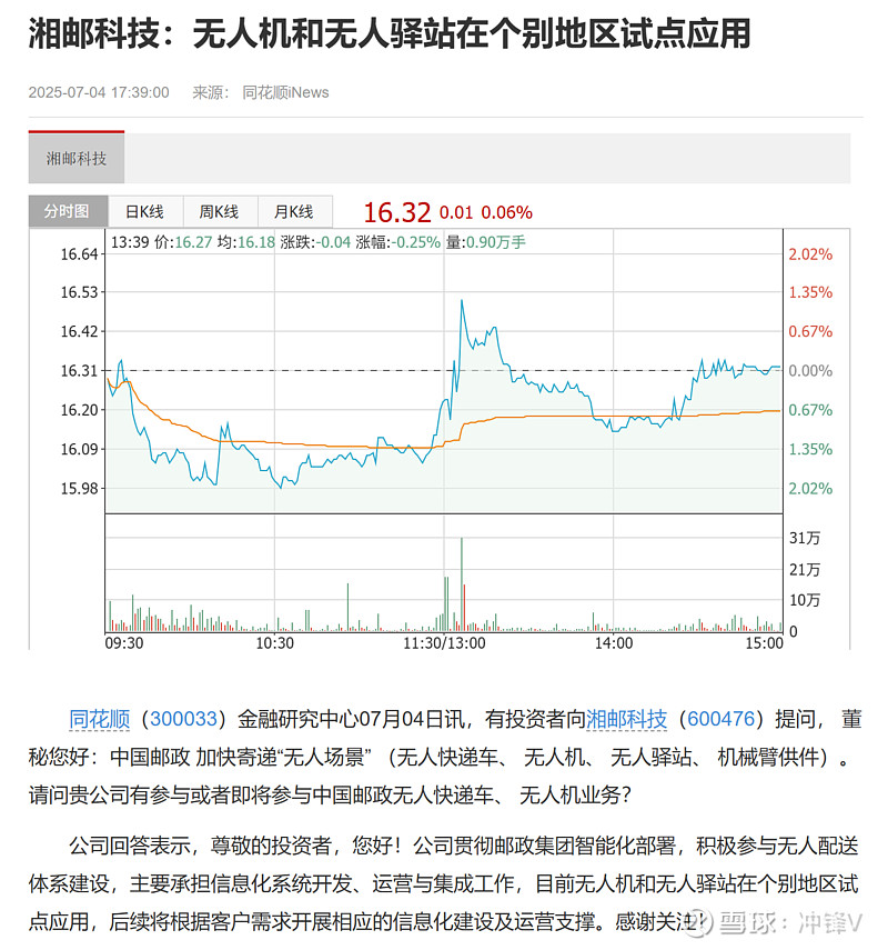 2. 估值重塑在即:市场此前对公司认知可能仍局限于传统软件集成商。随着低空物流这一高成长性业务逐步落地并贡献收入,公司估值体系有望与传统业务解耦,迎来重估。$湘邮科技(SH600476)$