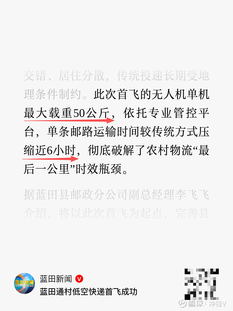 实效验证,场景打通:执行首飞任务的无人机最大载重达50公斤,将蓝田县的特色农产品和应急物资从县级分拨中心直接运抵村级网点。这成功验证了“农产品上行”和“应急物资配送”两大核心农村物流场景的可行性,为后续商业化、常态化运营奠定了坚实基础。