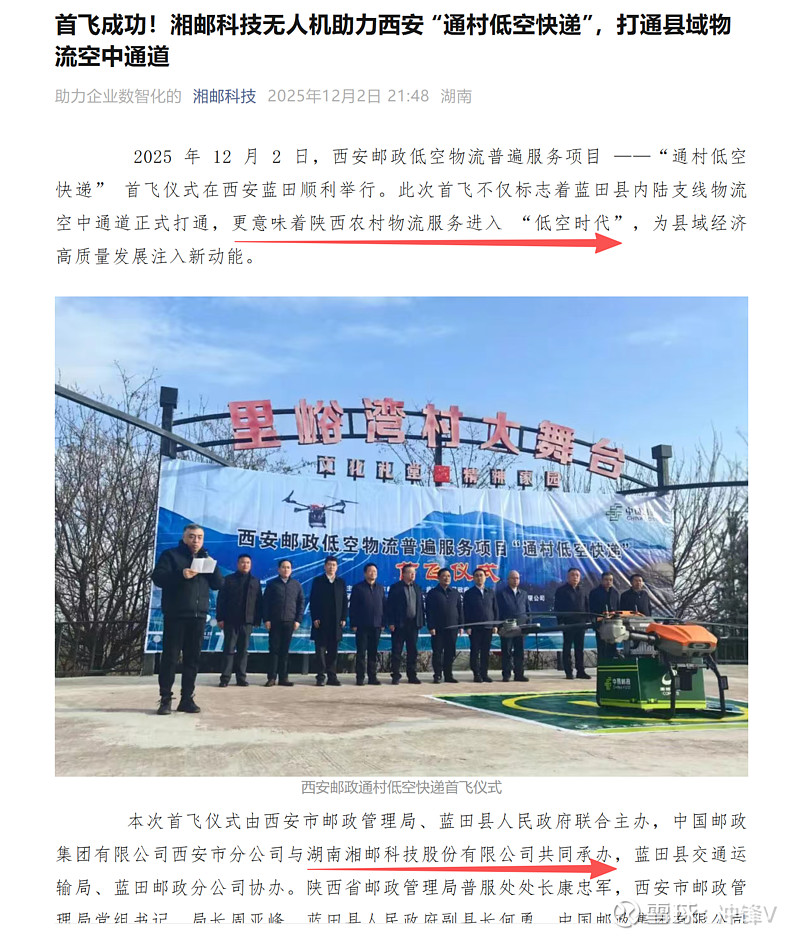 2025年12月2日,西安蓝田县“通村低空快递”首飞成功,具有里程碑意义,而湘邮科技在其中扮演了不可替代的核心角色。