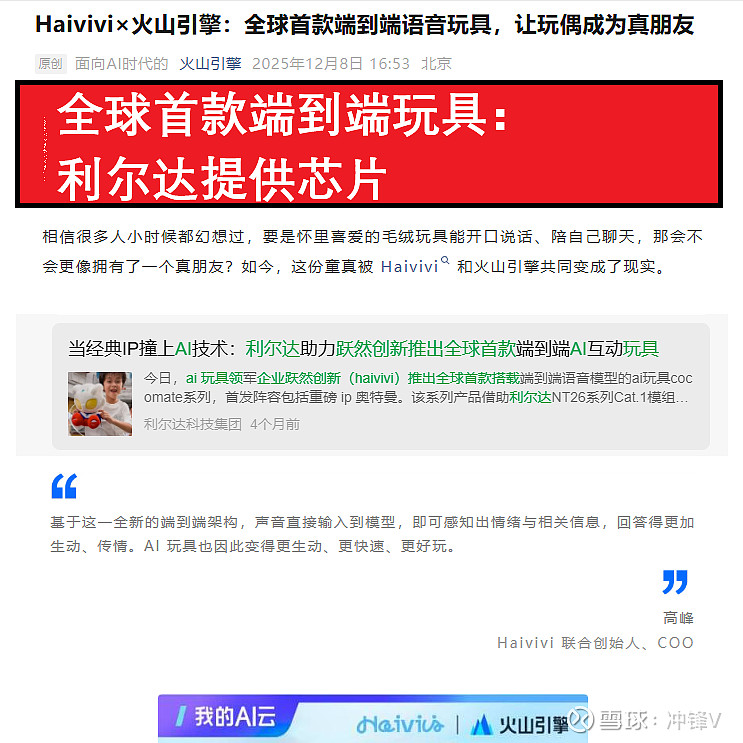 从0到1的深度参与: 利尔达并非简单的芯片分销商,而是为客户提供了完整的芯片解决方案。这意味着公司从产品定义阶段就深度介入,与Haivivi、火山引擎共同攻克端到端语音模型在终端侧的低功耗、高性能落地难题,技术壁垒与合作粘性极高。