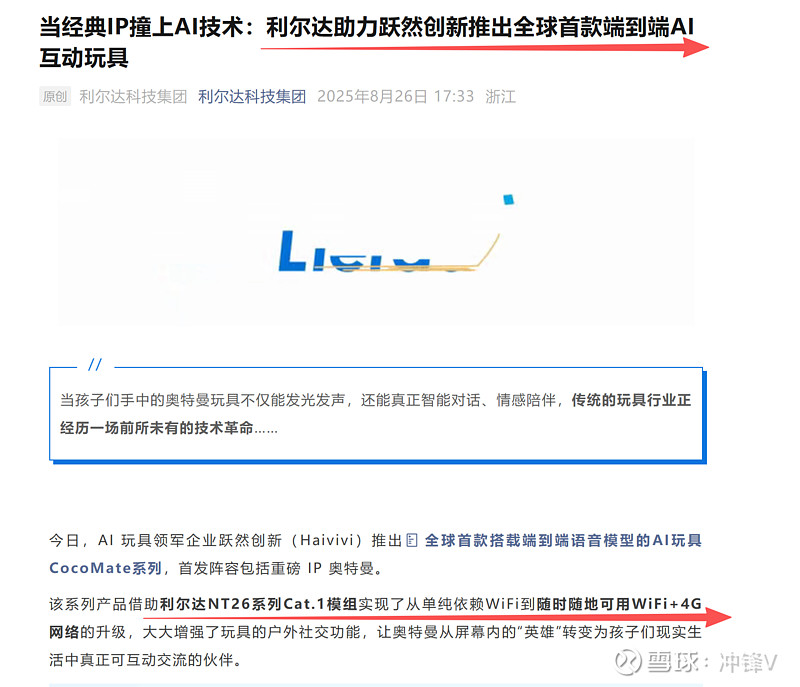 关键卡位明确,直接受益于产品放量。 据悉,利尔达正是这款划时代产品CocoMate系列的“核心芯片方案提供商”。芯片作为AI玩具的算力载体和交互基础,是决定产品性能、成本与稳定性的最关键环节。