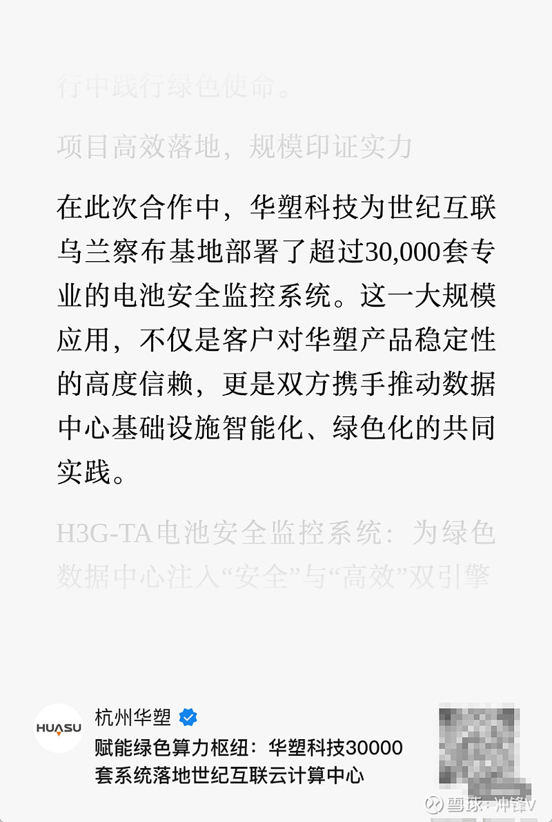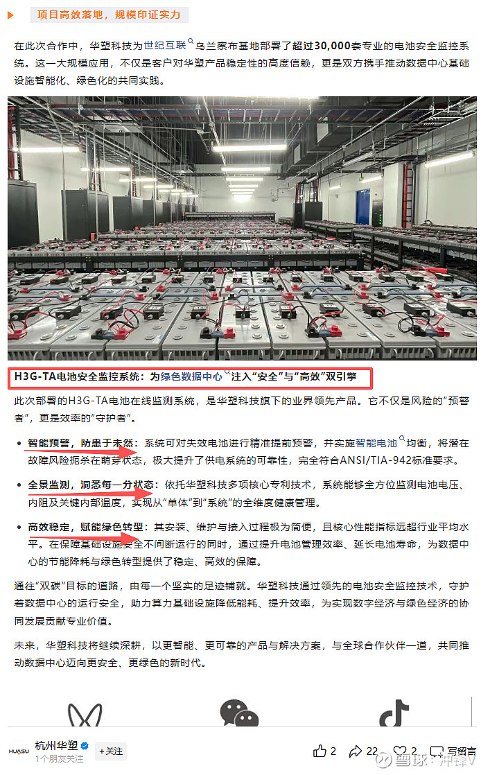 2、华塑科技斩获行业标杆性订单,奠定数据中心BMS龙头地位:公司成功为世纪互联乌兰察布云计算中心基地部署超过30,000套专业的H3G-TA电池安全监控系统。世纪互联是中国领先的第三方数据中心服务商,也是微软、腾讯、阿里等云巨头的重要供应商,其项目选择具备极强的行业示范效应。
