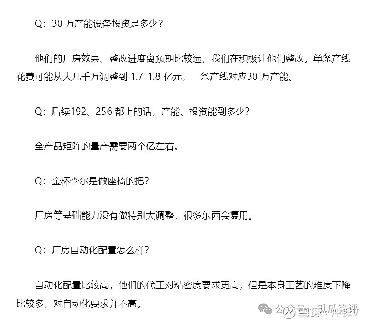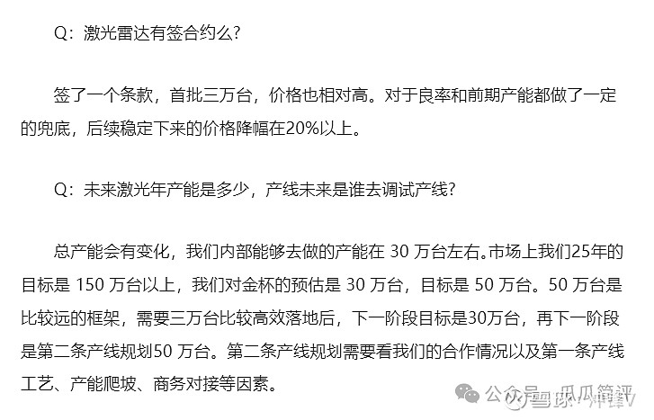 激光雷达:已签署合作条款,首批3万台订单锁定(单价2800-3000元),价格和良率有兜底协议,2025年目标产能30-50万台(总市场目标150万台)。产线厂房已就绪,设备即将进场,春节后开始产能爬坡。合作不仅限于当前产品,未来192/256线雷达代工也已明确。