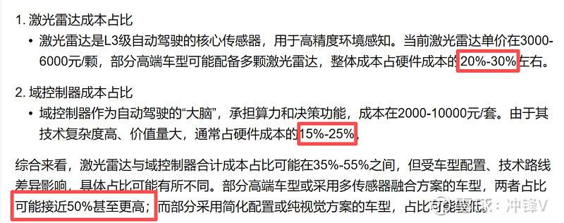 L3级自动驾驶硬件成本中,激光雷达+域控制器占比超50%,是单车价值量提升的核心环节及增量爆发点。