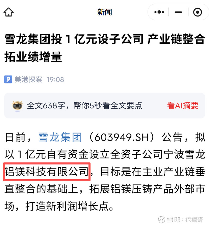 与仅做财务投资的概念股不同,雪龙集团围绕机器人产业进行了更深层次的产业卡位。公司近期公告,拟出资1亿元设立全资子公司“宁波雪龙铝镁科技有限公司”,正式进军铝镁合金压铸领域。