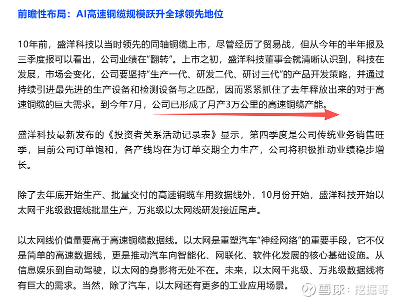 2、 AI高速铜缆供不应求,盛洋科技前瞻布局,目前已形成月产3万公里产能,规模跃升全球领先地位。