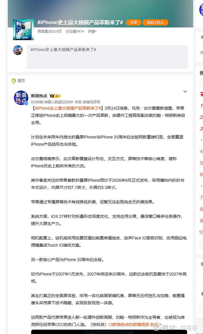 其中,首款折叠屏iPhone(暂命名iPhone Fold)预计2026年9月发布,采用横向内折书本式设计,内屏约7.7英寸、外屏约5.3英寸,搭载iOS 27深度优化的多任务交互系统,并创新采用侧边Touch ID替代Face ID。
