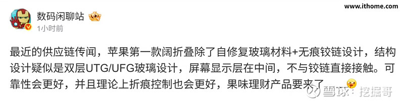 辅以自修复玻璃材料与无痕铰链设计,苹果已申请“智能玻璃层”专利,通过物理特性优化减少折叠应力,目标实现“近乎无折痕”体验。