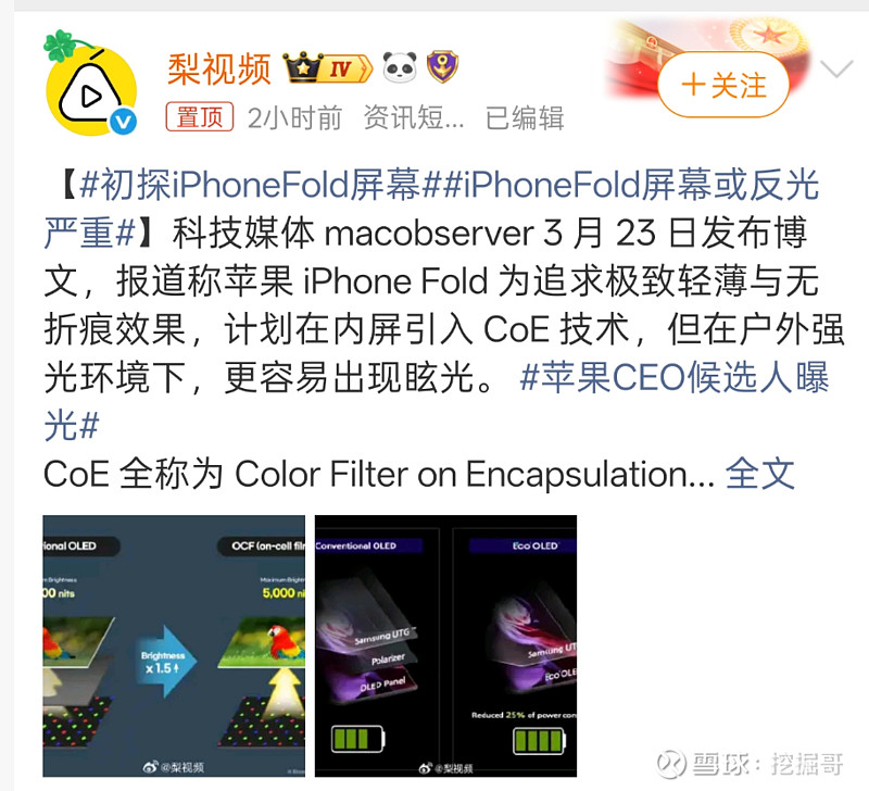 显示技术方面,苹果为追求极致轻薄与折痕控制,将引入**双层UTG(超薄柔性玻璃)+ CoE(彩色滤光片封装)方案: