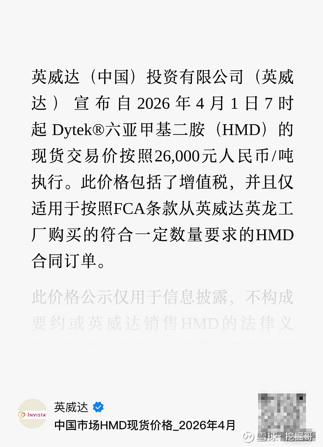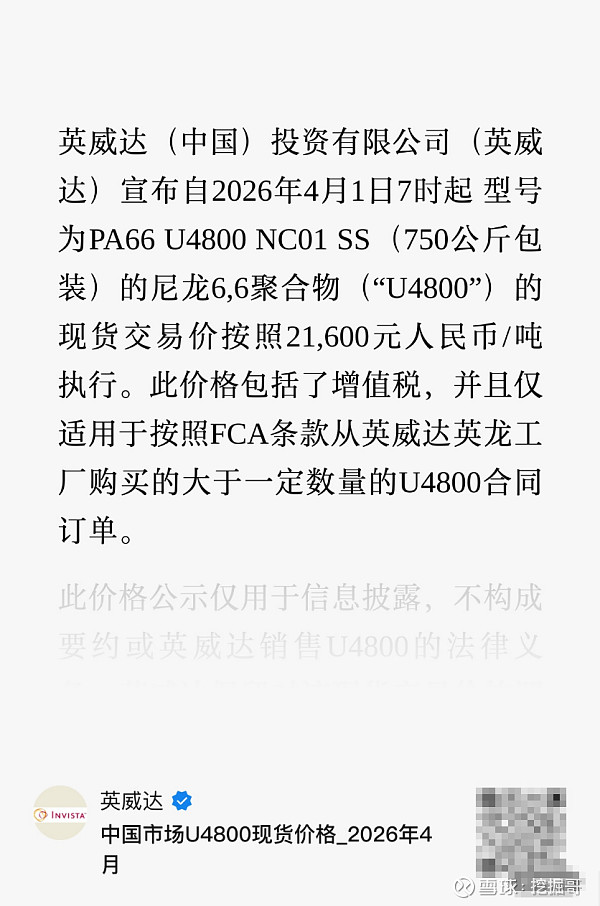 化工巨头英威达近期发布调价通知,自2026年4月1日起,PA66 U4800执行21600元/吨,较2025年Q3涨6600元/吨,涨幅高达30.5%。