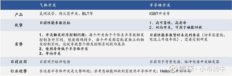 2、电源系统是FRC稳定运行的关键。FRC核聚变反应的关键在于使用θ-pinch线圈产生FRC等离子体,给θ-pinch线圈供电的高压脉冲电源能否精准放电,决定了等离子体参数的高低。开关技术直接决定放电效率、间接影响商业化可行性。