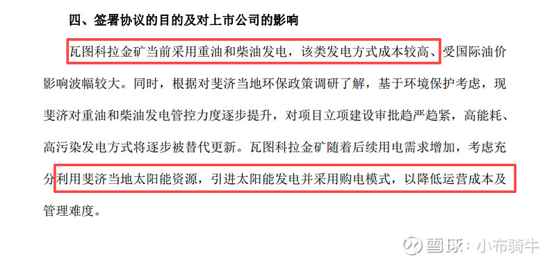 1、现有的重油和柴油发电成本高(超1元/度电),现改造为太阳能发电降低运营成本,斐济是赤道上的国家,每年利用小时数可以达到2000小时,成本直接降低至2毛以内,用电成本大幅下降。电力成本一般占采矿+选矿成本的25%-30%左右,这一项就能降本20%以上。