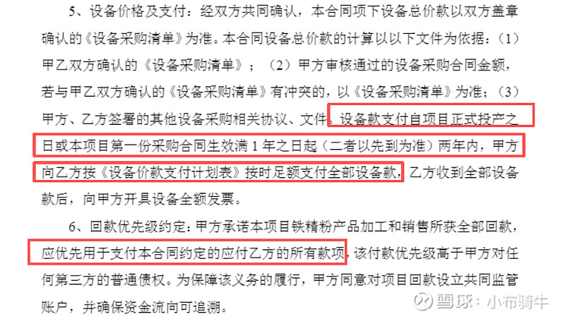 第二,铁矿公司应该是一时间拿不出这么多钱,公司先垫付设备款项,后续两年内通过项目运营产生的收入来还公司设备款项。这里面有个优先支付设备款项的条款,保证利益不受损。
