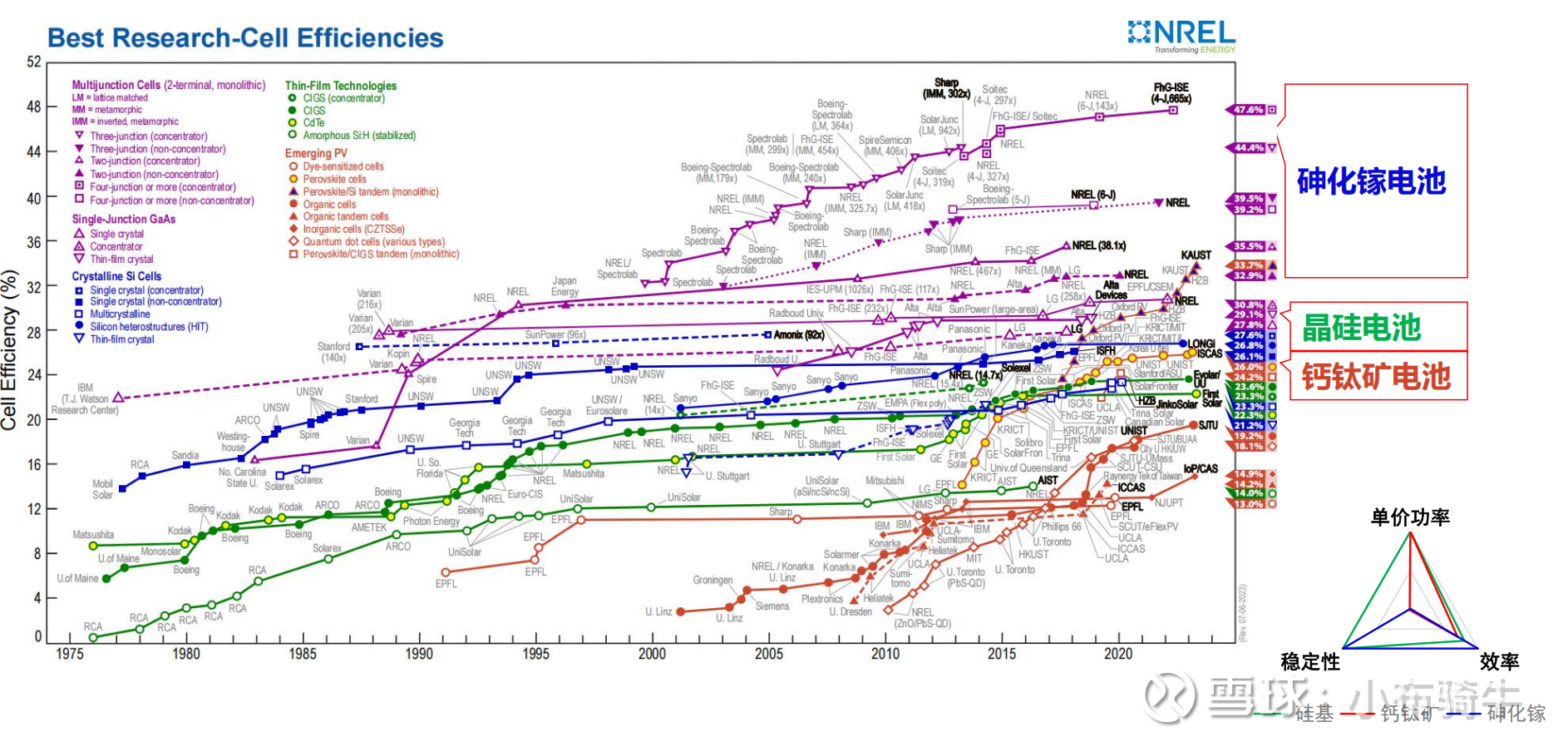 砷化镓——世界上最高效率的太阳能电池材料,这是材料性质所决定的。相较于晶硅和钙钛矿的效率天花板还停留在30%以内,砷化镓电池的实验效率天花板已经达到了48%,量产的效率已经达到了35%以上,远远高于其他技术路线。