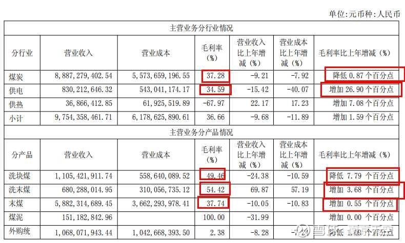 煤炭营收88.87亿,占比79.1%,毛利率37.3%,下降0.87个百分点。主要是售价最大的洗块煤(无烟煤)毛利率下降7.8%个百分点。