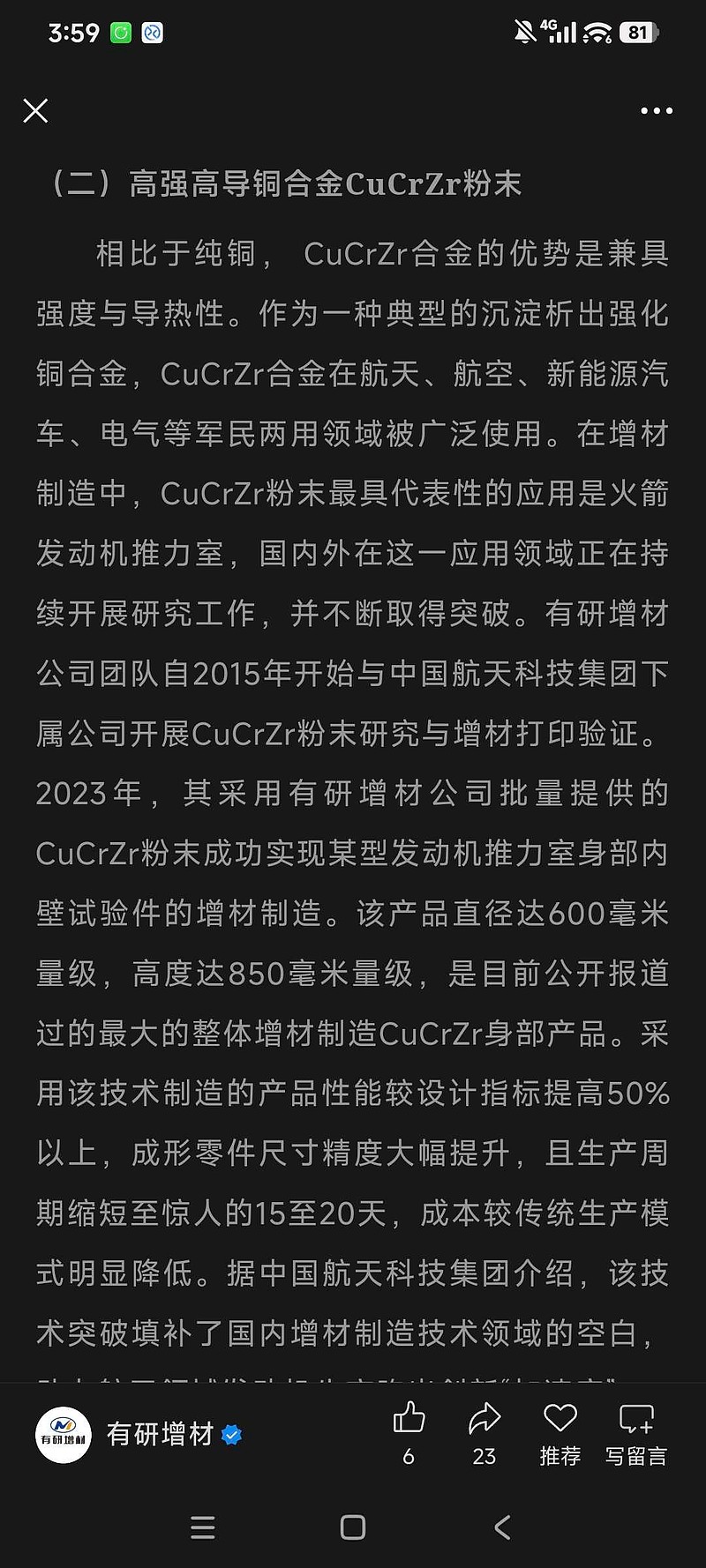 有研增材公司团队自2015年开始与中国航天科技集团下属公司开展CuCrZr粉末研究与增材打印验证。2023年,其采用有研增材公司批量提供的CuCrZr粉末成功实现某型发动机推力室身部内壁试验件的增材制造。该产品直径达600毫米量级,高度达850毫米量级,是目前公开报道过的最大的整体增材制造CuCrZr身部产品。采用该技术制造的产品性能较设计指标提高50%以上,成形零件尺寸精度大幅提升,且生产周期缩短至惊人的15至20天,成本较传统生产模式明显降低。据中国航天科技集团介绍,该技术突破填补了国内增材制造技术领域的空白,助力航天领域发动机生产跑出创新“加速度”。
