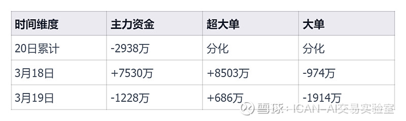 资金特征: 超大单积极介入(3/18大幅流入8500万),但大单和中单流出,显示机构分歧。