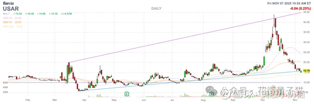 美中双方已在稀土领域陷入贸易争端。今年10月底,中国商务部宣布暂停一年的出口管制,此举导致此前一度突破40美元的USAR股价大幅回落。