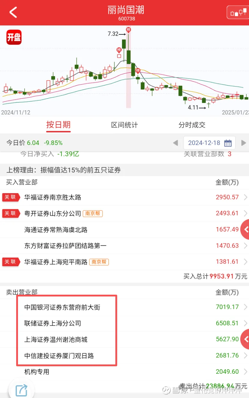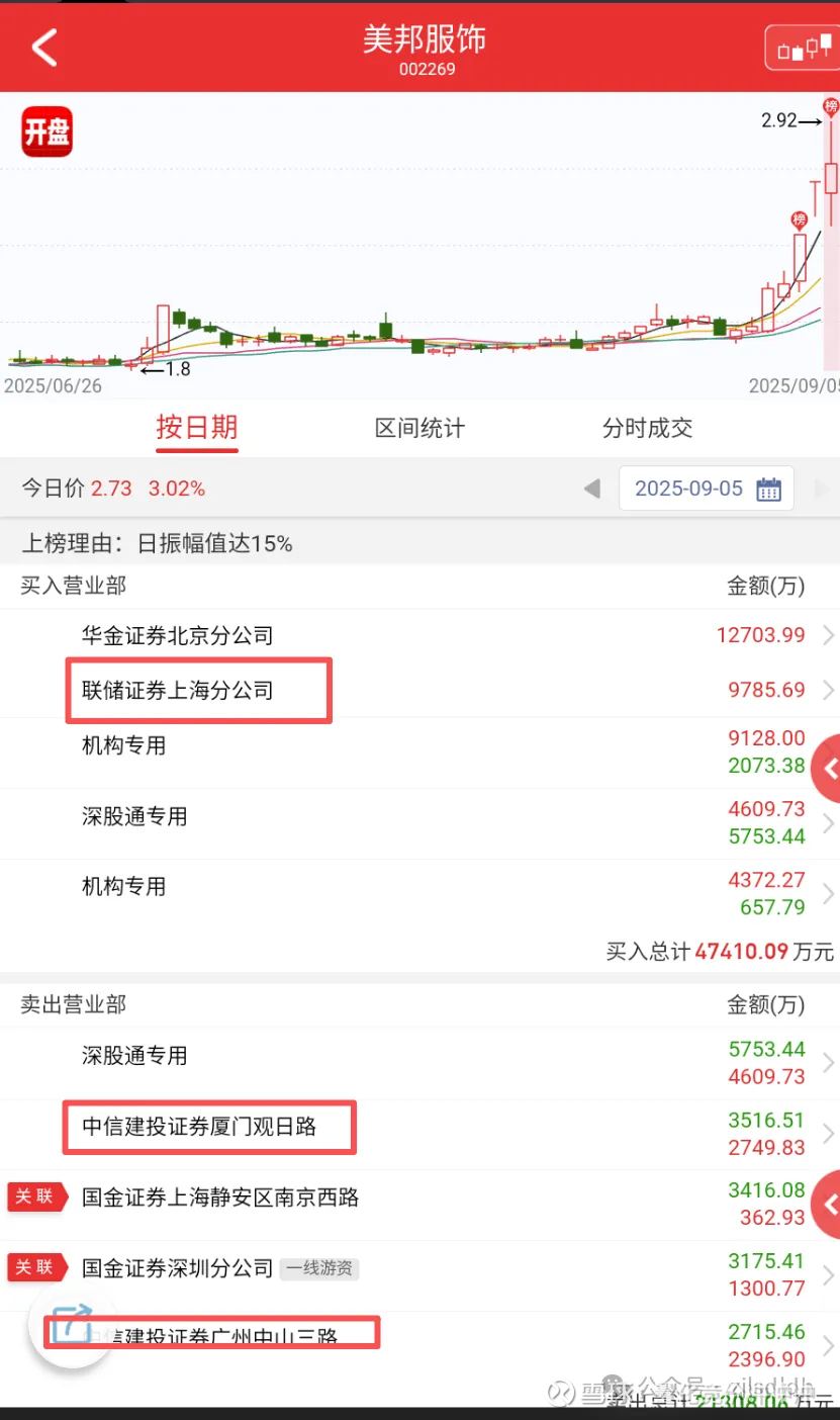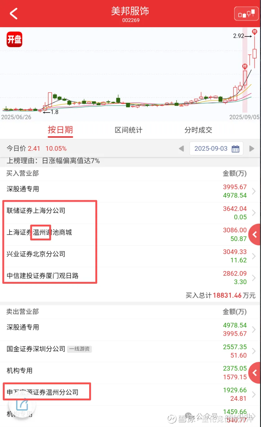 一模一样的卖出席位。四个人是联动席位,买榜有个上海证券温州席位,为什么我要把卖榜的温州席位标出来呢,因为美邦服饰老板是丽水人,他出生那是丽水还在温州底下,美邦发家也是在温州的。