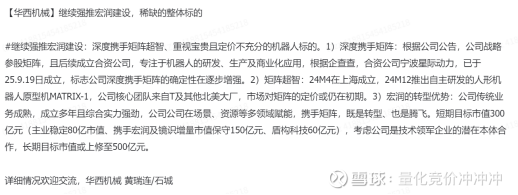 总结:正常股价的平均值差不多是在4-5元,对应市值50-60亿。主营最近几年连续萎缩,25年利润马上3亿不到,给10-15PE差不多就是30亿-45亿市值范围。现在又有了西南水电站的催化,按照卖方讲的就是主营修复预期,之前没有风口热点基本也不会有资金去看着算大概市值区间都是随风飘动所以股价可能会在3-5直接徘徊。现在风口来了大家就会细算,原本是个主营萎缩,又是基建行业,估值给的很低,然后业绩马上3亿不到,市值之前给30亿40亿也算合理。但是现在有了西南水电站的故事,公司层面也对此特别关注董事长特地跑过去一趟,然后还在那边建了生产工厂。这样的话主营业务拍到50亿不过分。差不多也就是目前矩阵对宏润市值的影响是在50亿-80亿之间。矩阵产品60W左右,在手订单过千,差不多今年营收是在5亿左右,今年王兴兴有个采访说宇树今年营收过10亿,宇树C轮融资过百亿,上市起码300亿打底差不多PS是大于30,实际上市按照A股尿性可能要千亿,优必选的PS也不低。矩阵这个公司有点不同的点是这个公司是这个公司是24年4月成立,第一代机器人产品是9月推出,然后截至今年9月份的交流在手订单破千台,明年订单指引破W台。矩阵的团队出身好,产品推出快,订单突破也快,字面信息上不输热门人形机器人一线(实机展示少,效果不好)。相比于其他的一线机器人合作方,合作紧密程度能有宏润跟矩阵这样的基本没有。卖方对标矩阵是当年的森特,如果矩阵换成是宇树可能就是了,森特是行业龙头入股然后产业协同,市场对矩阵的认识太少(如果是宇树这样合作可能就蹭蹭涨了)。合作转型机器人整机厂商,具备全产业链技术能力,钱地销路都有。后续会在人形机器人和建筑行业的机器人有预期,然后又是代工矩阵,往机器人代工厂商转换。公司也意图全面转型机器人,A股目前实打实稀缺的人形机器人整机企业。这波内幕盘兑现后感觉是有希望去200多亿的,但是后续的空间可能是需要矩阵2代产品情况的催化,合资公司进展情况催化。