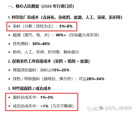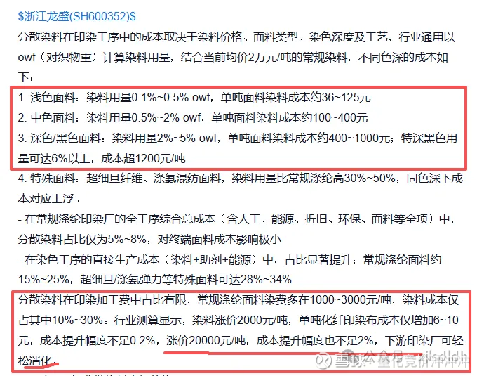 染料在印染厂中的成本占比低,延伸面料和成衣成本更低,只有1%左右,可以轻松的将涨价成本传递到终端,染料价格翻倍对成衣来讲成本变化也就增加3%以内,成衣厂可以轻松的将涨价传递到消费者,对消费者来讲成本变化肯定是成衣厂增长变化之下。