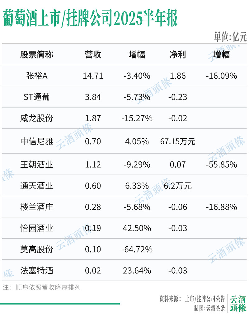 如今,中国葡萄酒上市酒企2025年中报的出炉再次验证了行业的这一趋势,营收排名前五的企业无一例外地处于继续下跌状态中,威龙股份、莫高股份的跌幅更是达到了两位数。不过,“龙头”张裕的跌幅仅有3.4%,相比去年同期的表现,已有明显的企稳迹象。ST通葡、王朝酒业的跌幅亦都在个位数,实现正增长并非完全不可能。