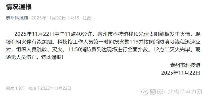 2025年11月22日中午11点40分许,泰州市科技馆楼顶光伏太阳能板发生火情,现场有明火伴有浓黑烟。科技馆工作人员第一时间报火警119并按照消防演习流程迅速应对,组织人员疏散、灭火,11:50消防员到达现场进行全面扑救。12点半灭火完毕。现场无人员伤亡。特此通报!