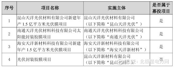 截至目前,公司已建立的光伏封装胶膜项目共4个,具体如下: