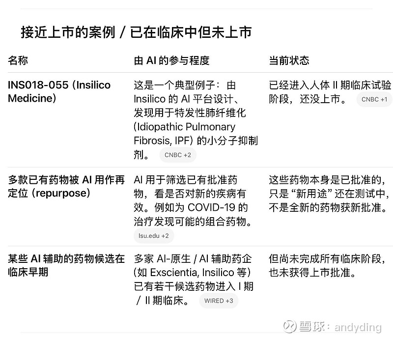 $晶泰控股(02228)$ 到目前为止,没有明确的例子表明某个药物从头完全由 AI 发现 + 设计,并且已经 上市/获 FDA 完全批准。也就是说,“AI 发现药物”这个领域已有不少进展,但真正完成从 AI 初步设计 → 临床试验 → 最终批准上市的案例尚未出现。下面是我整理的一些接近/相关案例,以及为什么到现在还没上市的原因。