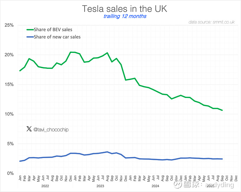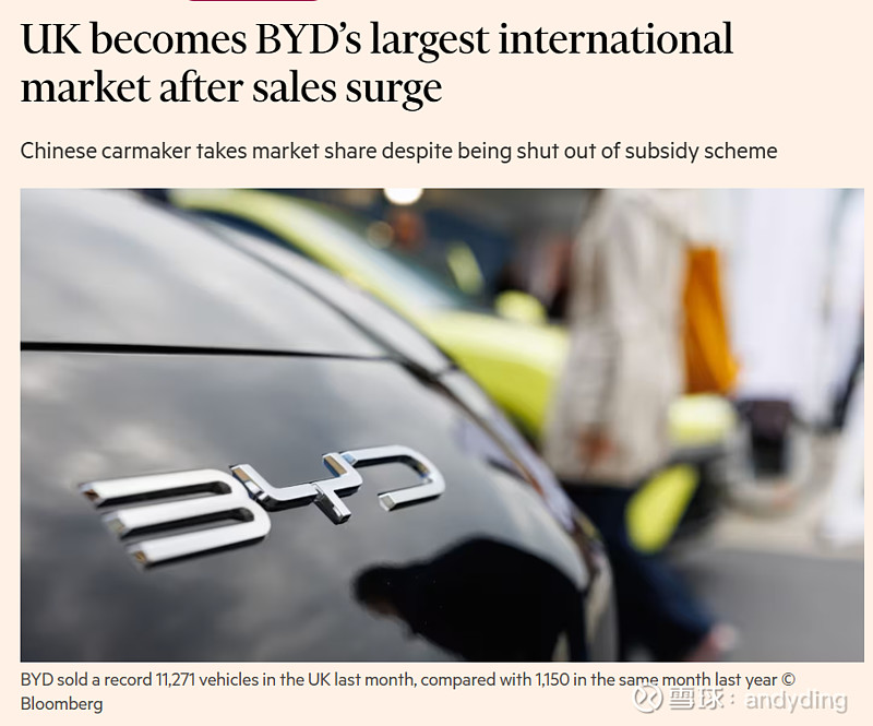 $比亚迪(SZ002594)$ $特斯拉(TSLA)$ BYD said on Monday that it sold a record 11,271 vehicles in the UK last month, compared with 1,150 in the same month last year. The Chinese carmaker, which undercuts most of its rivals on price, saw its market share jump to 3.6 per cent in September, putting it in second place behind Tesla in terms of EV sales.