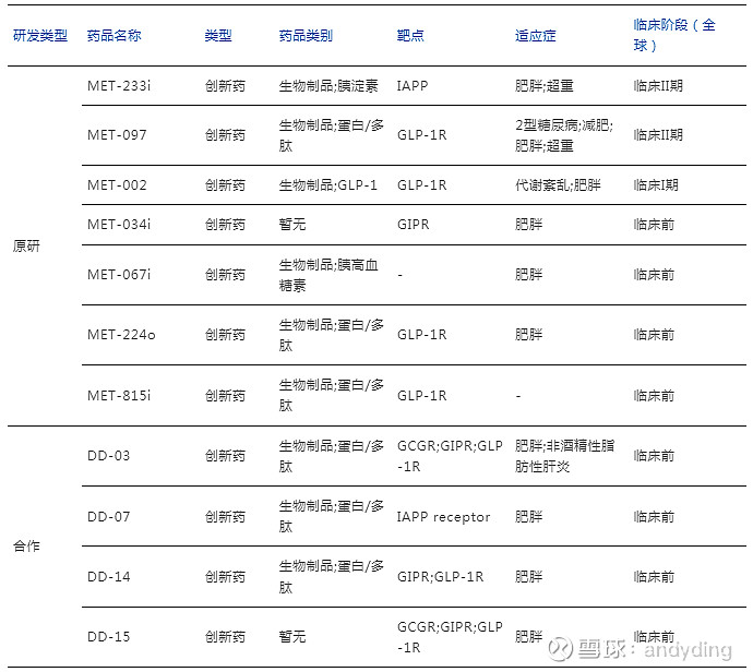 管线方面,Metsera的核心资产来源于两部分,其一是收购Zihipp所获得的原研管线,如MET-233、MET-097等;其二是通过与D&D的合作所获得的大量引进管线,如DD-03、DD-07等。
