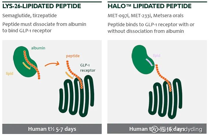 Mestera则选择在肽的C端或N端进行脂化,使其能够同时与白蛋白和药物靶点结合,从而降低清除率,半衰期时间达到了15-16天。