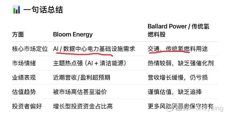 $潍柴动力(SZ000338)$ $巴拉德动力系统(BLDP)$ $Bloom Energy(BE)$ 下面是为什么Bloom Energy(固然燃料电池供应商)股价近期大幅上涨,而像巴拉德氢燃料公司(Ballard Power)这样的传统氢燃料电池股表现不佳的主要原因和市场逻辑——涵盖基本面、业务模式、市场预期和行业热点等因素: