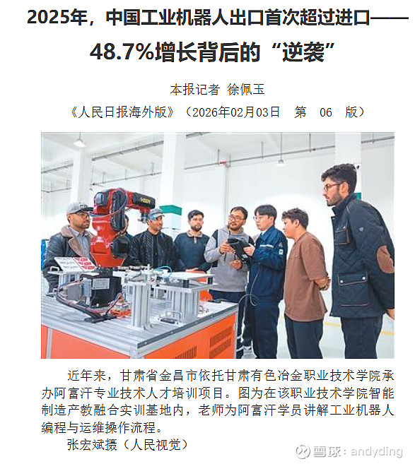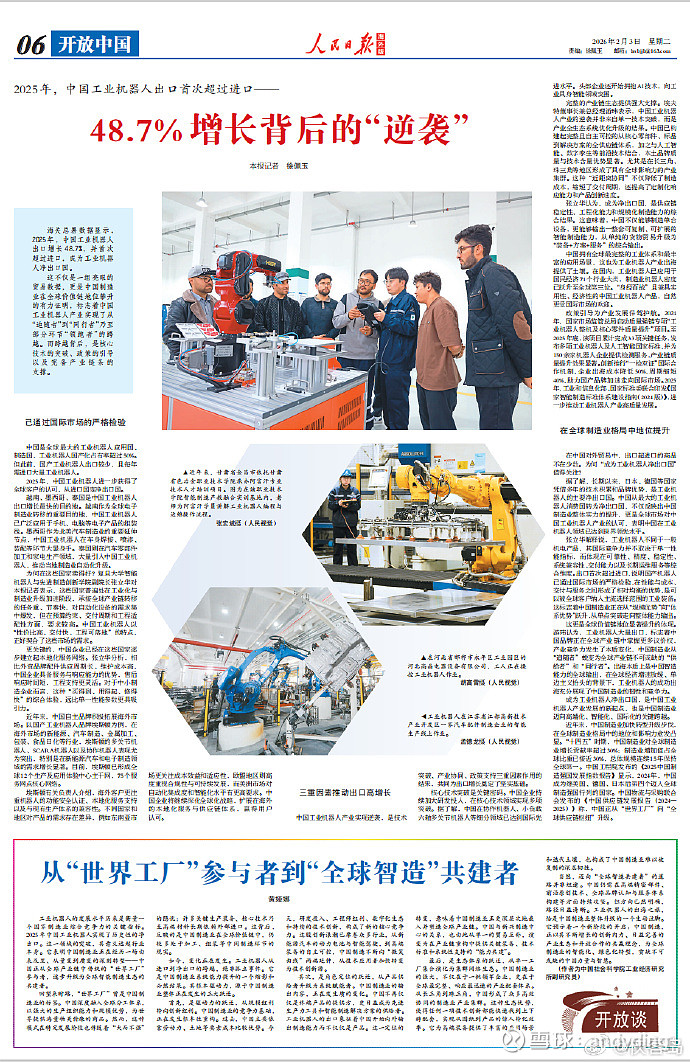 海关总署数据显示,2025年,中国工业机器人出口增长48.7%,并首次超过进口,成为工业机器人净出口国。