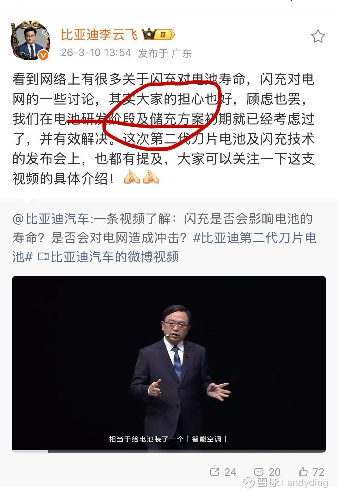(来自李云飞)看到网络上有很多关于闪充对电池寿命,闪充对电网的一些讨论,其实大家的担心也好,顾虑也罢,我们在电池研发阶段及储充方案初期就已经考虑过了,并有效解决。这次第二代刀片电池及闪充技术的发布会上,也都有提及,大家可以关注一下这支视频的具体介绍![作揖][作揖]