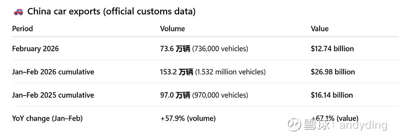 中国汽车出口量激增…… 想必其中大部分是电动汽车。今日数据显示,1 - 2 月出口额同比增长 57.9%,出口量同比增长 67.1%。