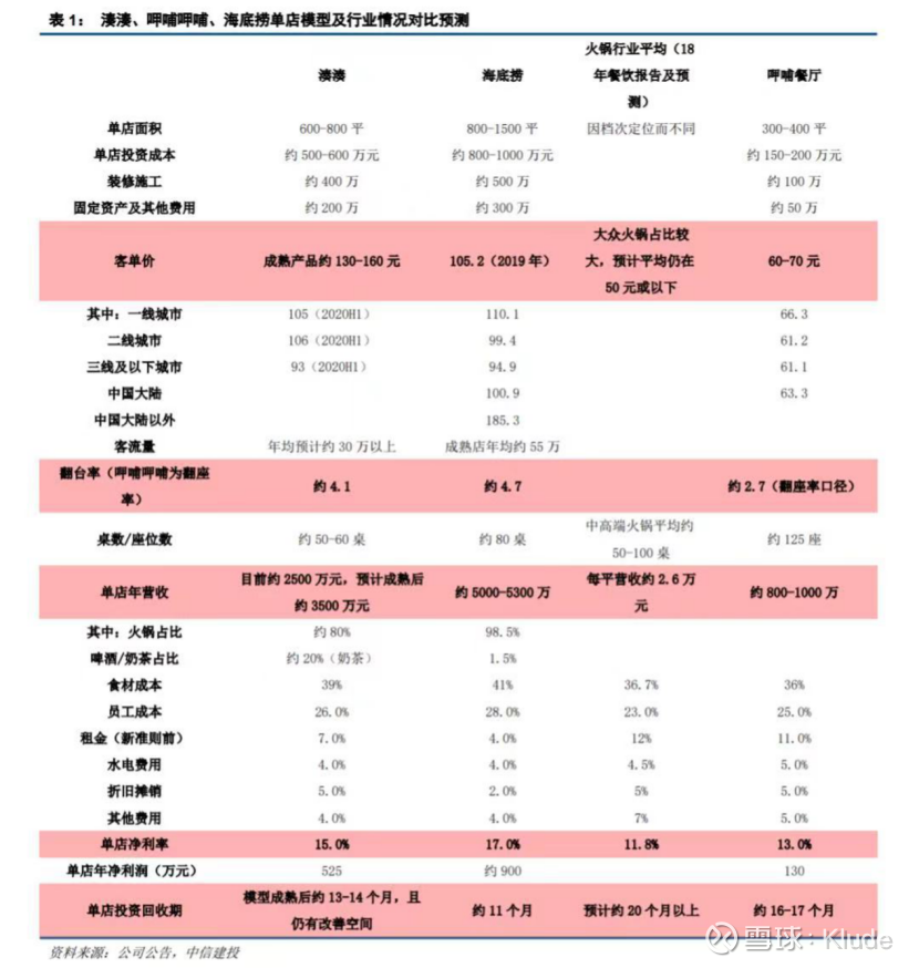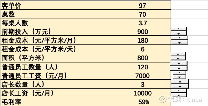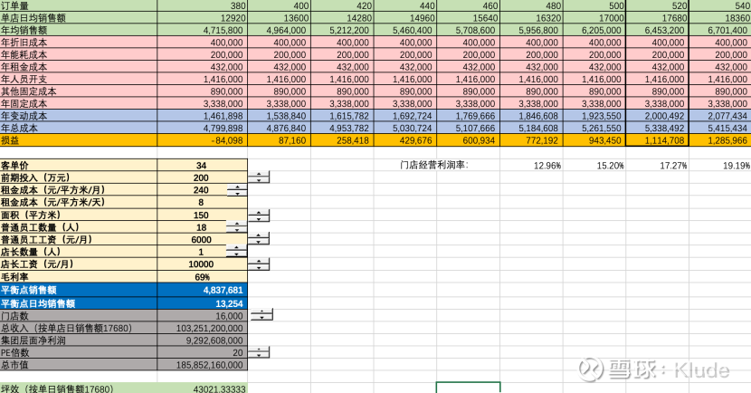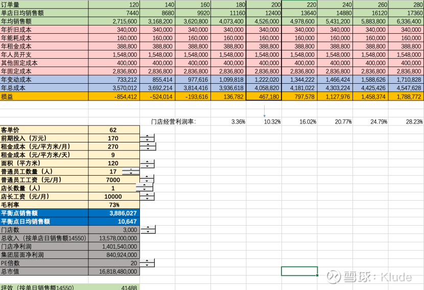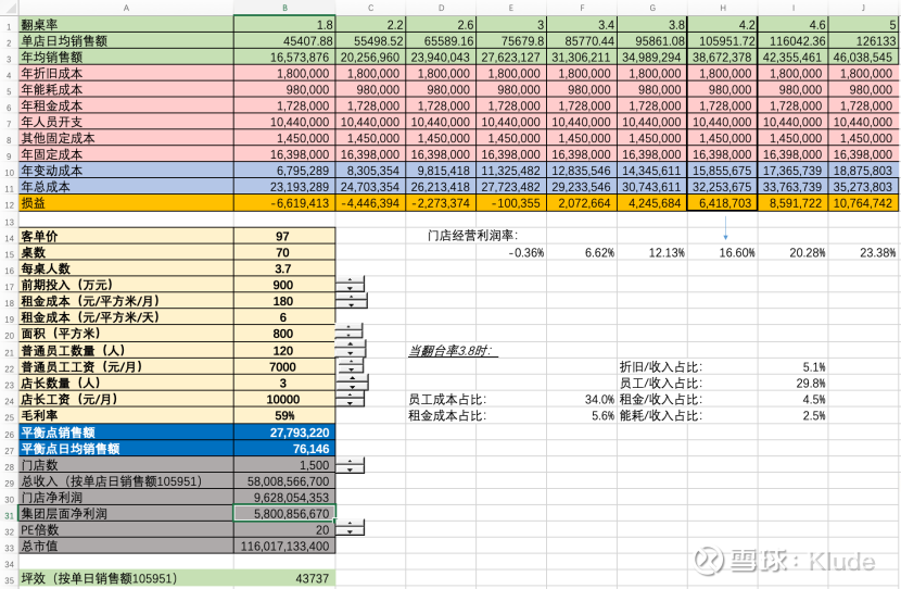 可以看到,券商的模型很完善:从前期门店投入,到翻台率、日均单量和销售额,再到成本拆分。但是券商不会把excel底稿发给我们,只是各个公司的横向对比呈现,无法反映每项数据的变化给公司带来的纵向变化。