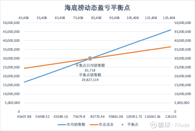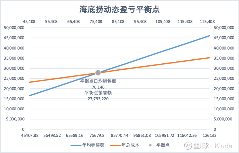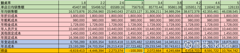 盈亏平衡点=固定成本/毛利率=1639.8/59%=2779万/年,因此,一年的营业额达到2800万左右(日均营业额7.6万元),方可盈亏平衡,即每天的翻台率要达到3.2-3.3。翻台率为3意味着:中午和晚上,门店至少都得坐满,并且有一半的桌子得接待第二波客人才行(中午和晚上各翻1.5桌)。