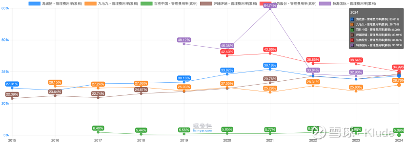 上市公司财报里的管理费用,就是门店员工+总部管理人员+折摊。海底捞管理费用率33%,各家管理费用率都是30%+。总部层面比门店层面多出来的,无非就是一些仓储冷链人员、总部指派的巡店人员、产品研发人员、高管、特许经营权摊销(如有)等等。