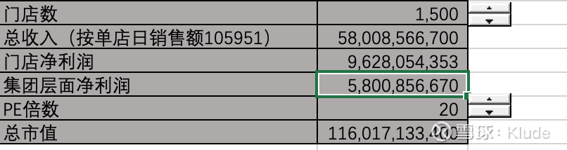 为了便于计算,我们还是尽可能的拟定一个稳态的销售额,选择一个最符合未来三年的模型,拟定年营收,直接用年营收乘以净利率(门店利润率-估计的总部利润率),对较远期(3~5年)的净利润进行预估。