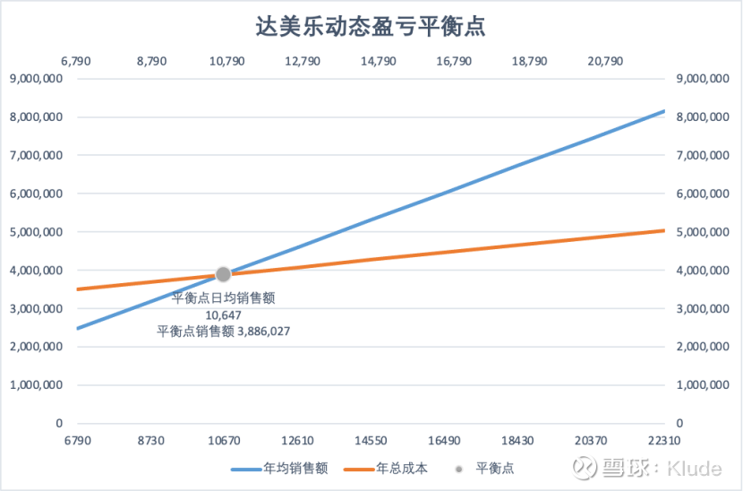 有了毛利率和固定成本了,我们就可以测算盈亏平衡点了,盈亏平衡点等于固定成本除以毛利率。有了表格之后,我们就可以顺势做出动态盈亏平衡点的图了: