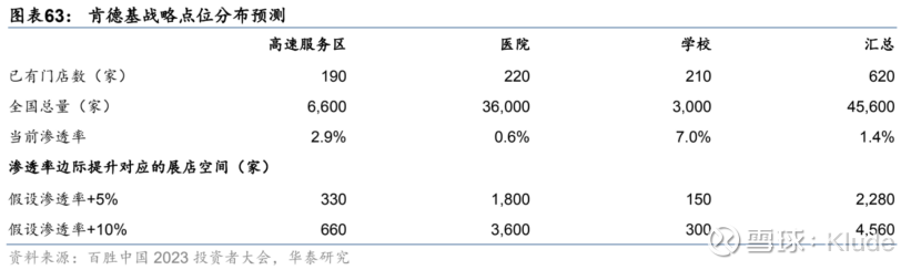肯德基的增长空间在特渠。机场、高铁站、医院、大学、交通枢纽、景区的肯德基属于特渠门店。全国的特渠一共4.6万个,肯德基特渠远期渗透率就算20%,都有万店的空间。